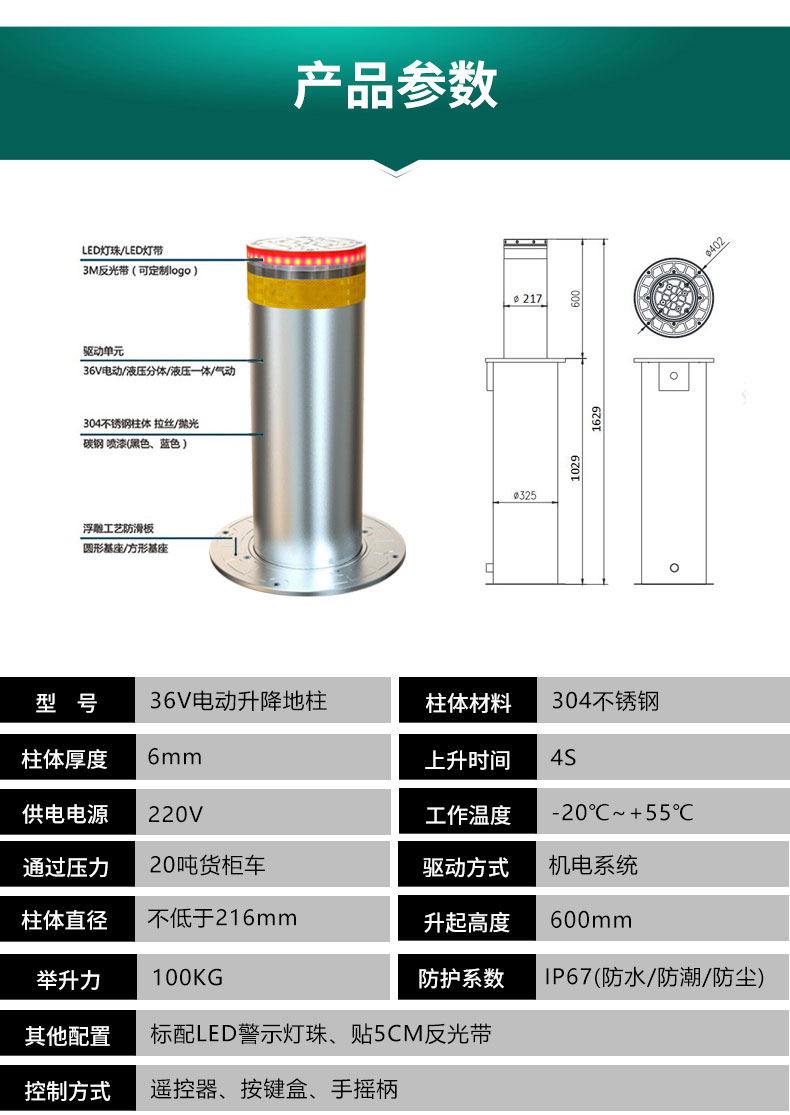 不锈钢36V电动升降地柱,可通过20吨货柜车,可防水/防潮/防尘。