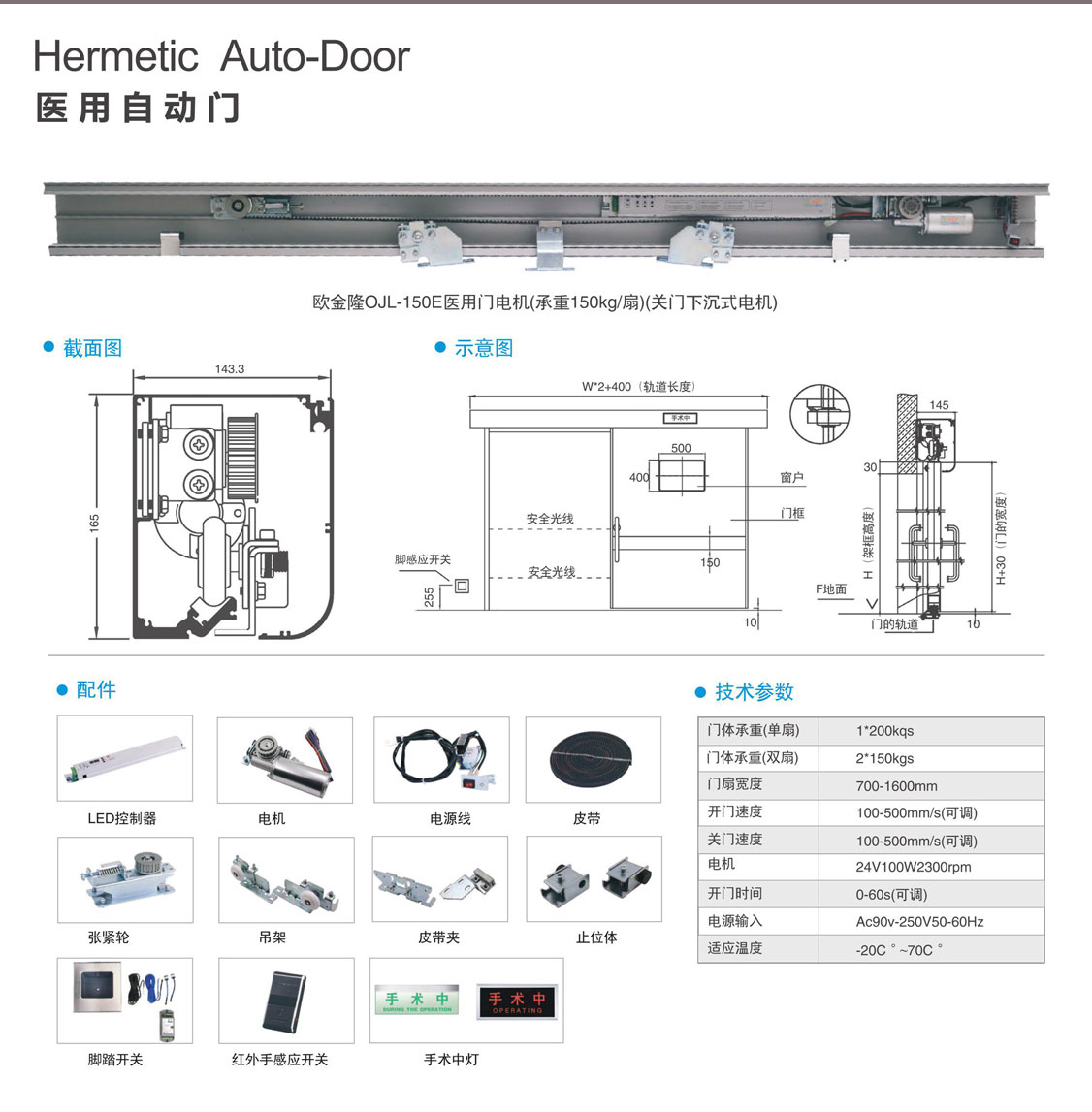 配有脚控开关和专用拉手,方便医护人员开门。专用拉手开门时上部顶住门柱,很小的推拉力即可开门。