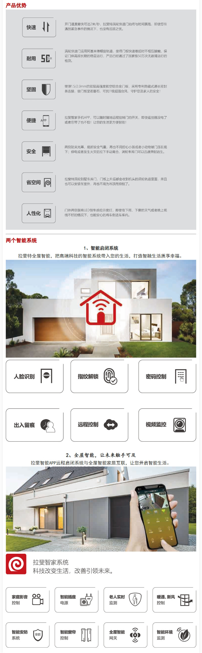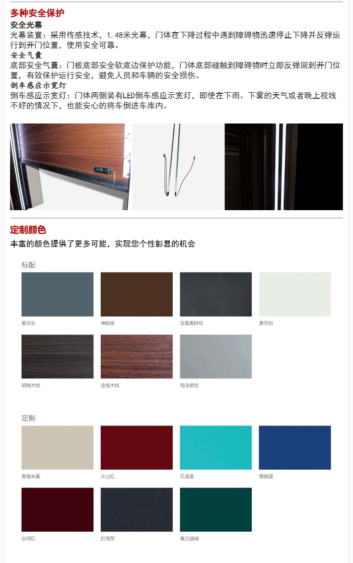别墅车库门——集快速、静音、节能、密封、高效、抗风、环保于一身的新型车库门,拥有很高的可靠性和实用性,其运行速度是普通车库门的10倍以上,凭借极高的工作效率,更高的安全性,美观的外形,满足家用车库门的需求。